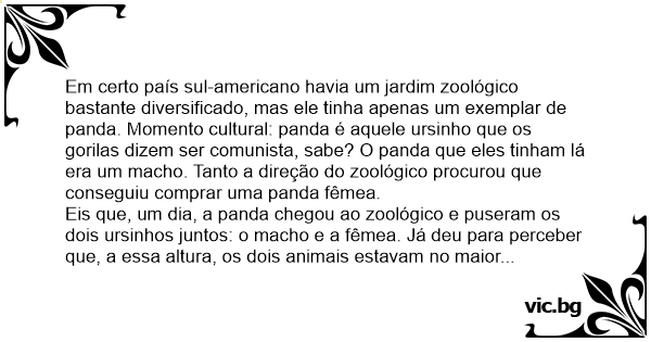 Em certo país sul-americano havia um jardim zoológico bastante diversificado, mas ele tinha apenas um exemplar de panda. Momento cultural: panda é aquele ursinho que os gorilas dizem ser comunista, sabe? O panda que eles tinham lá era um macho. Tanto a direção do zoológico procurou que conseguiu comprar uma panda fêmea.
