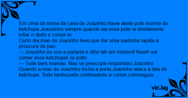 Em cima da mesa da casa de Joazinho,havia akele pote inorme de ketchupe,Joaozinho sempre quando via esse pote ia diretamente infiar o dedo e comer-lo.