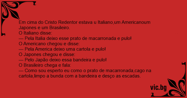 Em cima do Cristo Redentor estava u Italiano,um Americanoum Japones e um Brasileiro.