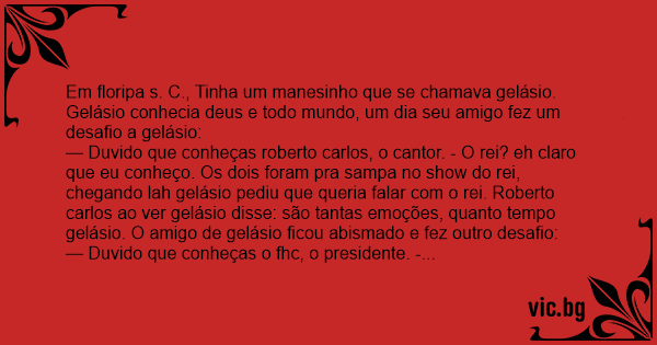— Duvido que conheças roberto carlos, o cantor. - O rei? eh claro que eu conheço. Os dois foram pra sampa no show do rei, chegando lah gelásio pediu que queria falar com o rei. Roberto carlos ao ver gelásio disse: são tantas emoções, quanto tempo gelásio. O amigo de gelásio ficou abismado e fez outro desafio: