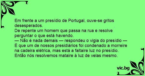 — Não é nada demais — respondeu o vigia do presídio — É que um de nossos presidiários foi condenado a morreire na cadeira elétrica, mas está a faltaire luz no presídio.
