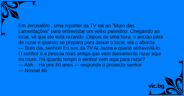 — Bom dia, senhor! Eu sou da TV Al Jazira e queria entrevistá-lo. O senhor é a pessoa mais antiga que vem diariamente rezar aqui no muro. Há quanto tempo o senhor vem aqui para rezar?
