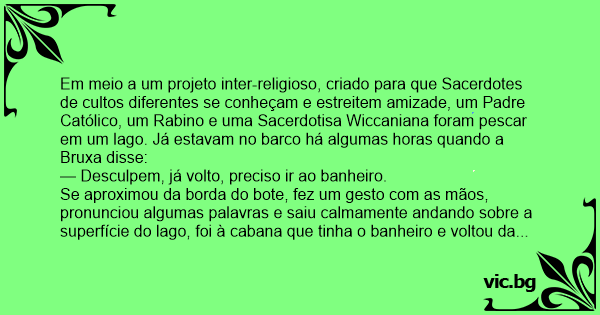 Foi à borda do bote, rezou um pai-nosso e deu um passo... imediatamente caindo no lago. Enquanto salvavam o Padre, o rabino cochichou para a bruxa: