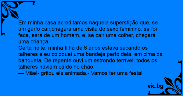 Em minha casa acreditamos naquela superstição que, se um garfo cair,chegara uma visita do sеxо feminino; se for faca, será de um homem, e, se cair uma colher, chegará uma criança.