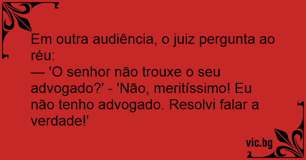 — 'O senhor não trouxe o seu advogado?' - 'Não, meritíssimo! Eu não tenho advogado. Resolvi falar a verdade!'