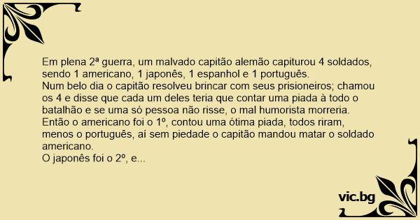 Então o americano foi o 1º, contou uma ótima piada, todos riram, menos o português, aí sem piedade o capitão mandou matar o soldado americano.