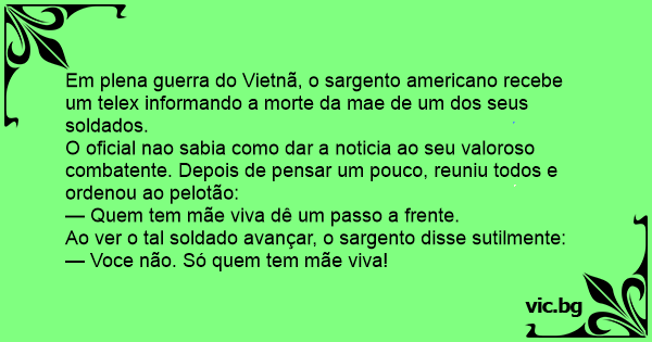 O oficial nao sabia como dar a noticia ao seu valoroso combatente. Depois de pensar um pouco, reuniu todos e ordenou ao pelotão: