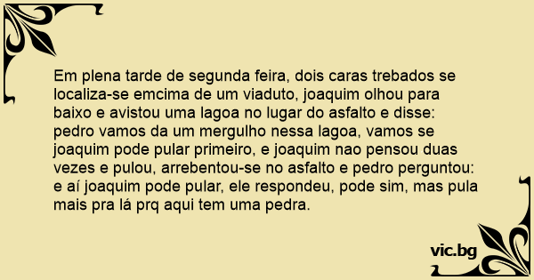Em plena tarde de segunda feira, dois caras trebados se localiza-se emcima de um viaduto, joaquim olhou para baixo e avistou uma lagoa no lugar do asfalto e disse: pedro vamos da um mergulho nessa lagoa, vamos se joaquim pode pular primeiro, e joaquim nao pensou duas vezes e pulou, arrebentou-se no asfalto e pedro perguntou: e aí joaquim pode pular, ele respondeu, pode sim, mas pula mais pra lá prq aqui tem uma pedra.