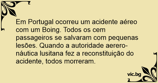 Em Portugal ocorreu um acidente aéreo com um Boing. Todos os cem passageiros se salvaram com pequenas lesões. Quando a autoridade aerero- náutica lusitana fez a reconstituição do acidente, todos morreram.
