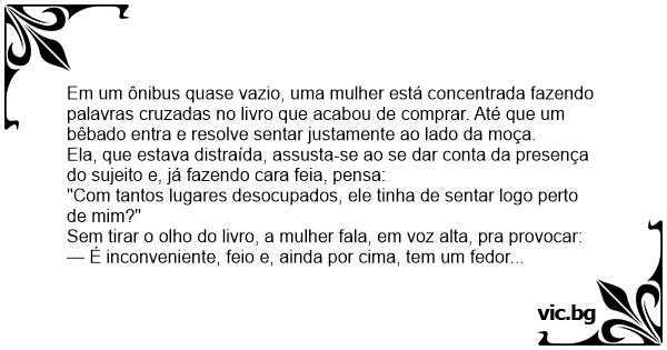 Em um ônibus quase vazio, uma mulher está concentrada fazendo palavras cruzadas no livro que acabou de comprar. Até que um bêbado entra e resolve sentar justamente ao lado da moça.