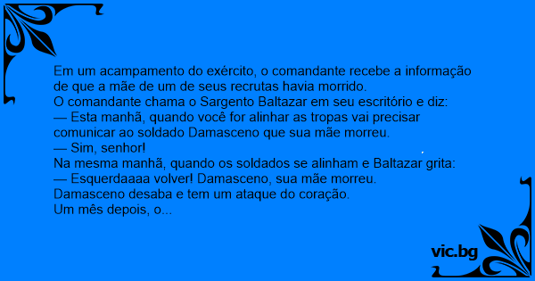 — Baltazar, você precisa contar ao soldado Peçanha que sua mãe morreu. Mas desta vez, use alguma tática. Não quero perder mais outro bom recruta.