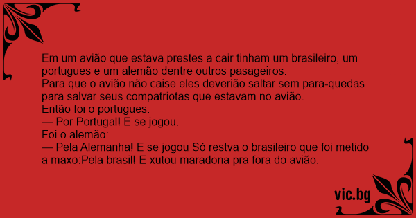 — Pela Alemanha! E se jogou Só restva o brasileiro que foi metido a maxo:Pela brasil! E xutou maradona pra fora do avião.