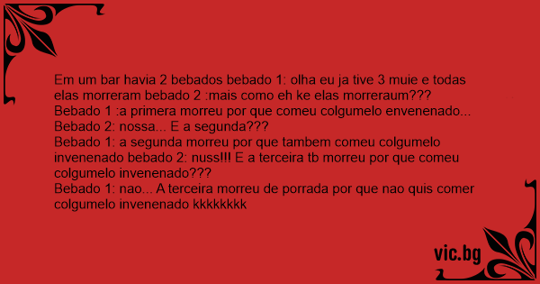 Em um bar havia 2 bebados bebado 1: olha eu ja tive 3 muie e todas elas morreram bebado 2 :mais como eh ke elas morreraum???