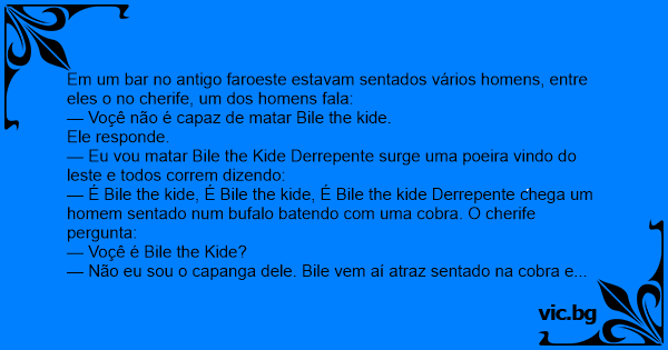 — É Bile the kide, É Bile the kide, É Bile the kide Derrepente chega um homem sentado num bufalo batendo com uma cobra. O cherife pergunta:
