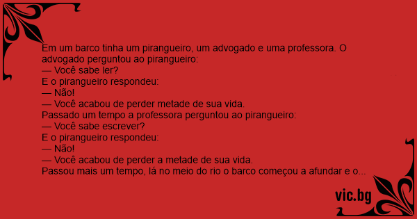 Em um barco tinha um pirangueiro, um advogado e uma professora. O advogado perguntou ao pirangueiro: