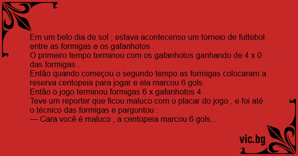 Então quando começou o segundo tempo as formigas colocaram a reserva centopeia para jogar e ela marcou 6 gols.