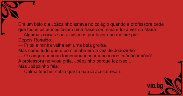 Em um belo dia Joãozinho estava no colégio quando a professora pede que todos os alunos fasam uma frase com rima e foi a vez da Maria: