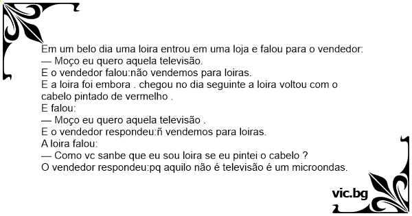 Uma loira chega em uma certa loja e chama o vendedor!!! — Vendedor eu quero comprar aquela televisao ali!!! O vendedor respode!! — Minha senhora nao vendemoas pra loiras A loira foi em casa pintou...