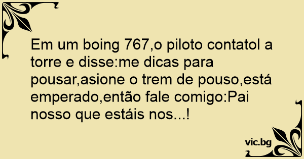 Em um boing 767,o piloto contatol a torre e disse:me dicas para pousar,asione o trem de pouso,está emperado,então fale comigo:Pai nosso que estáis nos...!
