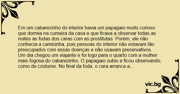 Em um cabarezinho do interior havia um papagaio muito curioso que dormia na cumeira da casa e que ficava a observar todas as noites as fodas dos caras com as prostitutas. Porém, ele não conhecia a camisinha, pois pessoas do interior não estavam tão preocupados com essas doenças e não usavam preservativos.
