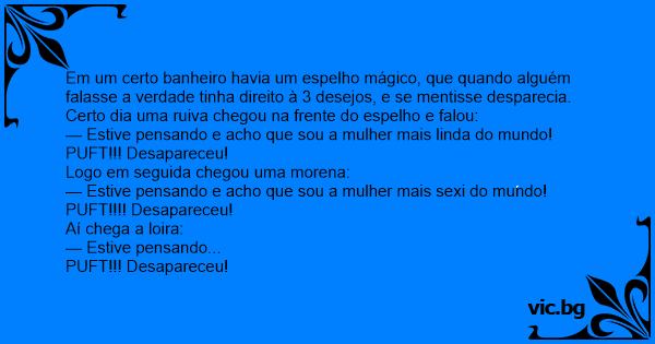 Em um certo banheiro havia um espelho mágico, que quando alguém falasse a verdade tinha direito à 3 desejos, e se mentisse desparecia.