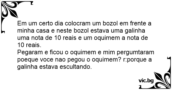 Em um certo dia colocram um bozol em frente a minha casa e neste bozol estava uma gаlinhа uma nota de 10 reais e um oquimem a nota de 10 reais.