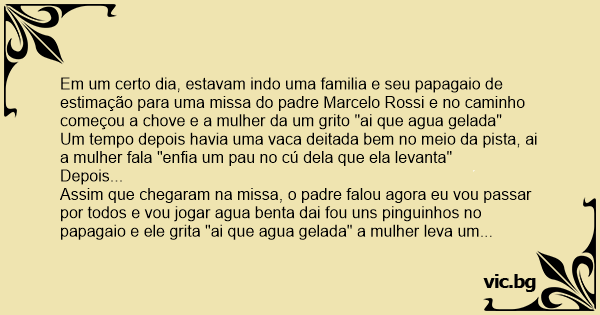 Em um certo dia, estavam indo uma familia e seu papagaio de estimação para uma missa do padre Marcelo Rossi e no caminho começou a chove e a mulher da um grito "ai que agua gelada"