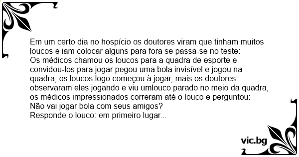 Os médicos chamou os loucos para a quadra de esporte e convidou-los para jogar pegou uma bola invisível e jogou na quadra, os loucos logo começou à jogar, mais os doutores observaram eles jogando e viu umlouco parado no meio da quadra, os médicos impressionados correram até o louco e perguntou: