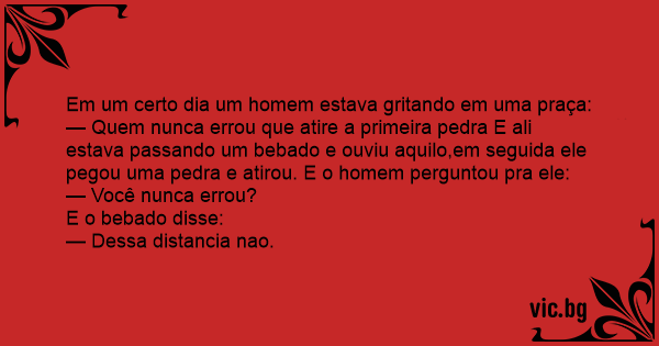 — Quem nunca errou que atire a primeira pedra E ali estava passando um bebado e ouviu aquilo,em seguida ele pegou uma pedra e atirou. E o homem perguntou pra ele: