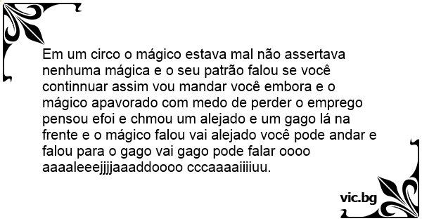Em um circo o mágico estava mal não assertava nenhuma mágica e o seu patrão falou se você continnuar assim vou mandar você embora e o mágico apavorado com medo de perder o emprego pensou efoi e chmou um alejado e um gago lá na frente e o mágico falou vai alejado você pode andar e falou para o gago vai gago pode falar oooo aaaaleeejjjjaaaddoooo cccaaaaiiiiuu.