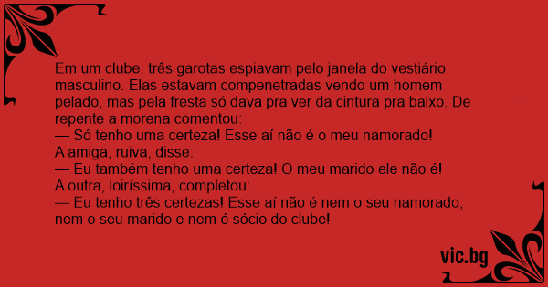 Em um clube, três garotas espiavam pelo janela do vestiário masculino. Elas estavam compenetradas vendo um homem pelado, mas pela fresta só dava pra ver da cintura pra baixo. De repente a morena comentou: