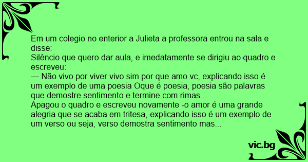 Eu tenho uma professora chamada julieta, quando ela passa da vontade de enfiar todos os dez dedos na sua..., imediatamente juãozinho olhou para sua professora e disse a sinhora quer em verso ou em poesia, ai ela com todos os anos de experiencia pensou se eu pedir em poesia ele dirar na вuсета, então eu quero em verso.