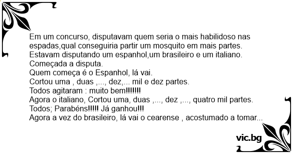 Em um concurso, disputavam quem seria o mais habilidoso nas espadas,qual conseguiria partir um mosquito em mais partes. Estavam disputando um espanhol,um brasileiro e um italiano.