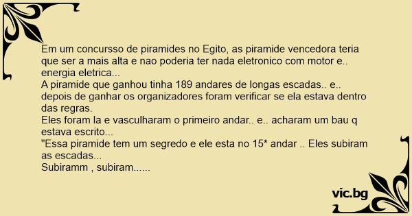 Subiramm , subiram... e.. acharam outro baú.. estava escrito " o segredo da piramide esta no 154* andar.. eles mortos de cancaço subiram.. subiram.. Subiram... e la estava outro bau q estava escrito" o segredo da piramide esta no ultimo andar la eles acharam outro bau q estava escrito " o segredo da piramide esta no 2* andar eles desceram.. desceram.. e la estava outro bau escrito.. o segredo da Piramide é q ela tem elevador.