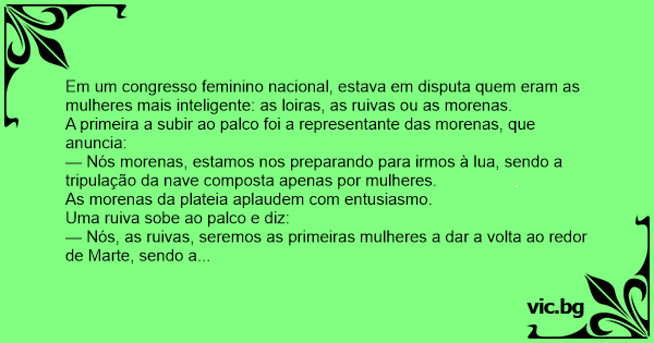 Em um congresso feminino nacional, estava em disputa quem eram as mulheres mais inteligente: as loiras, as ruivas ou as morenas.
