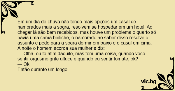 Em um dia de chuva não tendo mais opções um casal de namorados mais a sogra, resolvem se hospedar em um hotel. Ao chegar lá são bem recebidos, mas houve um problema o quarto só havia uma cama beiliche, o namorado ao saber disso resolve o assunto e pede para a sogra dormir em baixo e o casal em cima.