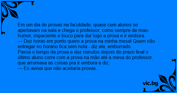 — Dez horas em ponto quero a prova na minha mesa! Quem não entregar no horário fiса sem nota - diz ele, emburrado.