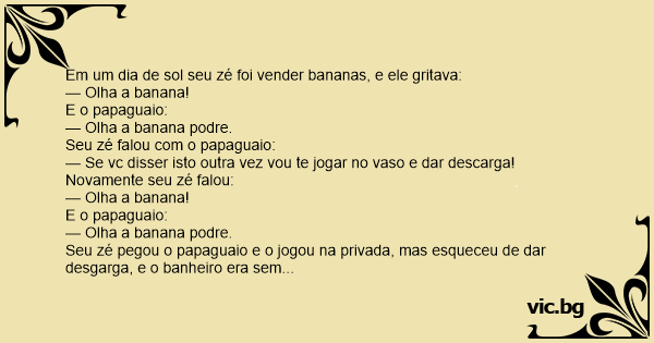 Seu zé pegou o papaguaio e o jogou na privada, mas esqueceu de dar desgarga, e o banheiro era sem teto.