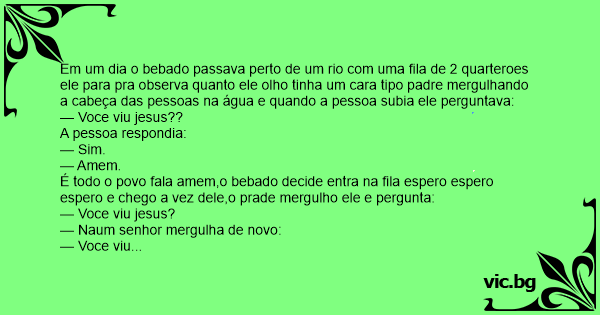 Em um dia o bebado passava perto de um rio com uma fila de 2 quarteroes ele para pra observa quanto ele olho tinha um cara tipo padre mergulhando a cabeça das pessoas na água e quando a pessoa subia ele perguntava: