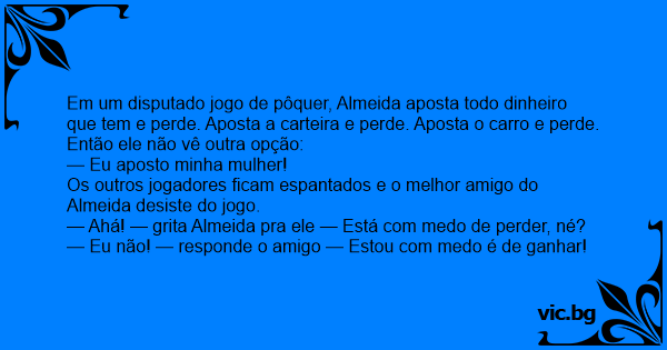 Em um disputado jogo de pôquer, Almeida aposta todo dinheiro que tem e perde. Aposta a carteira e perde. Aposta o carro e perde. Então ele não vê outra opção: