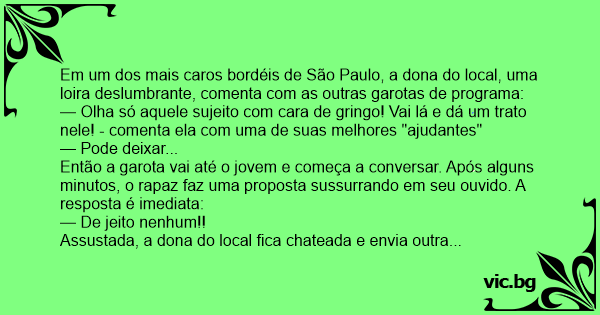 Em um dos mais caros bordéis de São Paulo, a dona do local, uma loira deslumbrante, comenta com as outras garotas de programa: