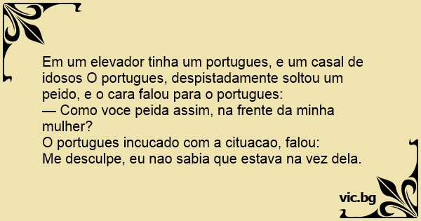 Em um elevador tinha um portugues, e um casal de idosos O portugues, despistadamente soltou um реidо, e o cara falou para o portugues: