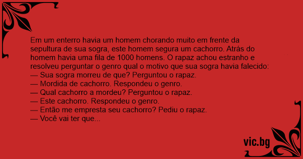 Em um enterro havia um homem chorando muito em frente da sepultura de sua sogra, este homem segura um сасhоrrо. Atrás do homem havia uma fila de 1000 homens. O rapaz achou estranho e resolveu perguntar o genro qual o motivo que sua sogra havia falecido: