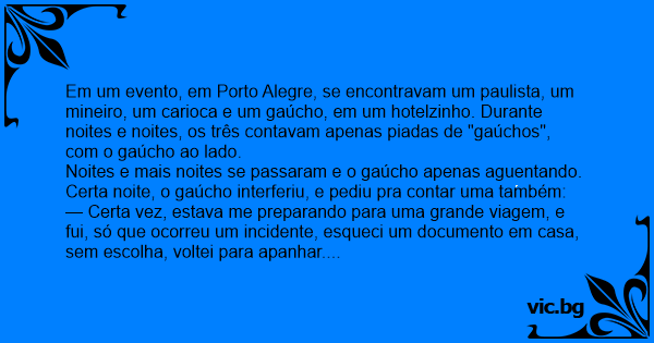 Em um evento, em Porto Alegre, se encontravam um paulista, um mineiro, um carioca e um gaúcho, em um hotelzinho. Durante noites e noites, os três contavam apenas piadas de "gaúchos", com o gaúcho ao lado.