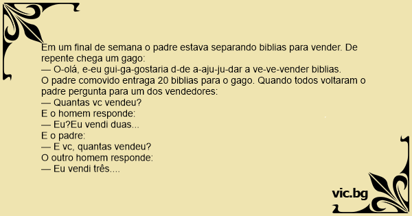 O padre comovido entraga 20 biblias para o gago. Quando todos voltaram o padre pergunta para um dos vendedores: