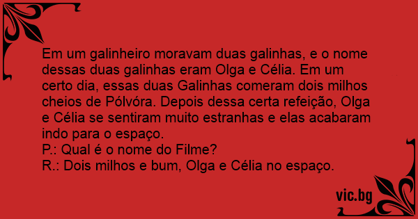 Em um galinheiro moravam duas galinhas, e o nome dessas duas galinhas eram Olga e Célia. Em um certo dia, essas duas Galinhas comeram dois milhos cheios de Pólvóra. Depois dessa certa refeição, Olga e Célia se sentiram muito estranhas e elas acabaram indo para o espaço.