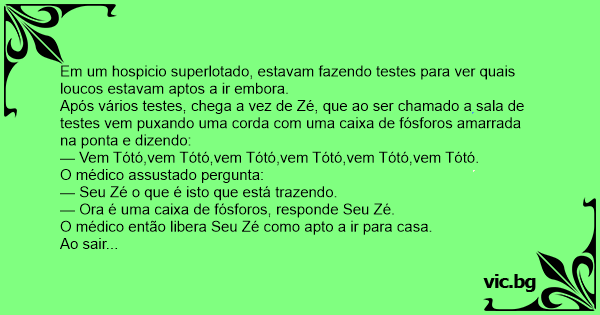 Após vários теsтеs, chega a vez de Zé, que ao ser chamado a sala de теsтеs vem puxando uma corda com uma caixa de fósforos amarrada na ponta e dizendo: