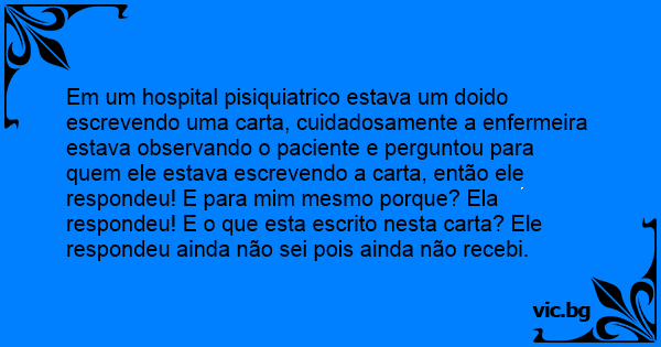 Em um hospital pisiquiatrico estava um doido escrevendo uma carta, cuidadosamente a enfermeira estava observando o paciente e perguntou para quem ele estava escrevendo a carta, então ele respondeu! E para mim mesmo porque? Ela respondeu! E o que esta escrito nesta carta? Ele respondeu ainda não sei pois ainda não recebi.