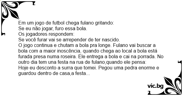 O jogo continua e chutam a bola pra longe. Fulano vai buscar a bola com a maior inoscência, quando chega ao local a bola está furada presa numa roseira. Ele entrega a bola e cai na porrada. No outro dia tem una festa na rua de fulano,quando ele pensa: