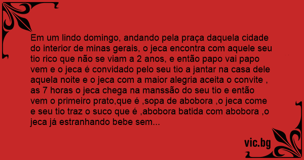 Em um lindo domingo, andando pela praça daquela cidade do interior de minas gerais, o jeca encontra com aquele seu tio rico que não se viam a 2 anos, e então papo vai papo vem e o jeca é convidado pelo seu tio a jantar na casa dele aquela noite e o jeca com a maior alegria aceita o convite , as 7 horas o jeca chega na manssão do seu tio e então vem o primeiro prato,que é ,sopa de abobora ,o jeca come e seu tio traz o suco que é ,abobora batida com abobora ,o jeca já estranhando bebe sem questionar, em seguida seu tio traz a sobremesa que é ,abobora recheada com abobora, e ai o jeca fiса nervoso e fala muito zangado para seu tio, o senhor fique sabendo que abobora na minha casa eu do é pra роrсо viu,e o seu tio responde na hоrа, e na minha também!!!!!!!!!!!